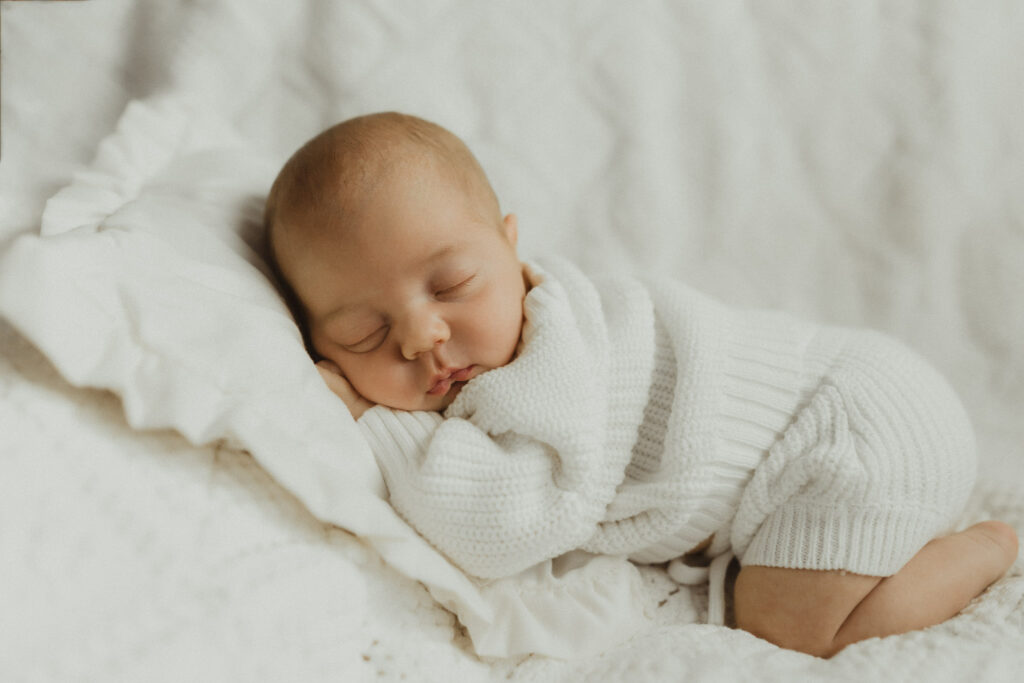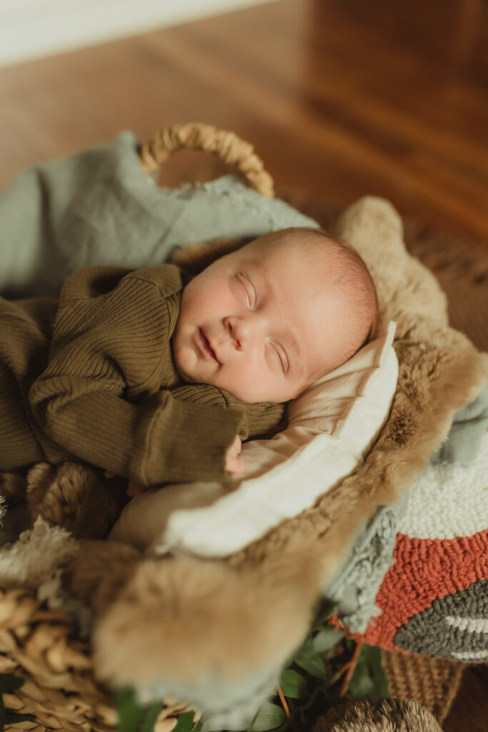 Looking for a lifestyle newborn session that has a nice blend of lifestyle and styled photos of your newborn and family? Styled portraits are planned out portraits using props. My particular brand of styled newborn portraits are designed to not look overly posed or fake. I use natural window light (or outside sunlight) rather than studio lights and use props (baskets, stuffed animals, and real flowers and greenery) that look like they could be found in a cottage in the countryside or have a vintage look. In the newborn portraits from the session below I used a white vintage quilt and pillow that are both heirlooms in my client’s family. The basket portraits used a woodland animal theme using items I mostly found in their nursery. These are a select few from this newborn session in Columbus Ohio. I am not including family photos to keep photos of big sister private.