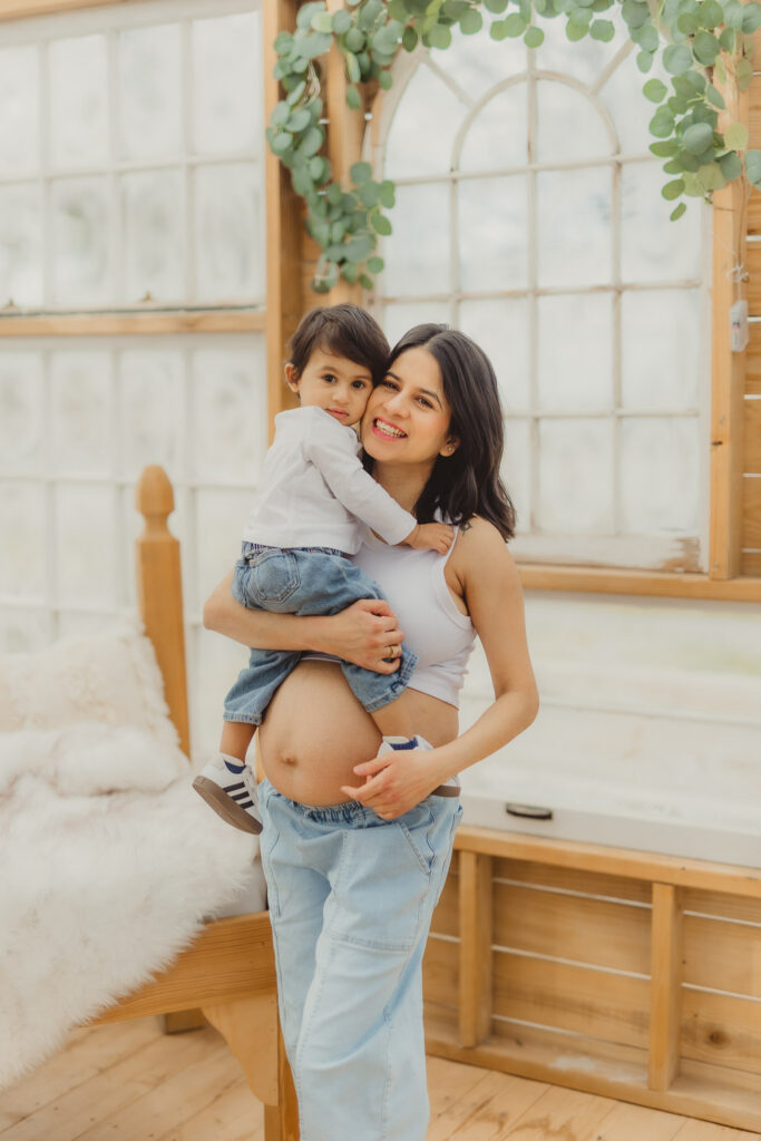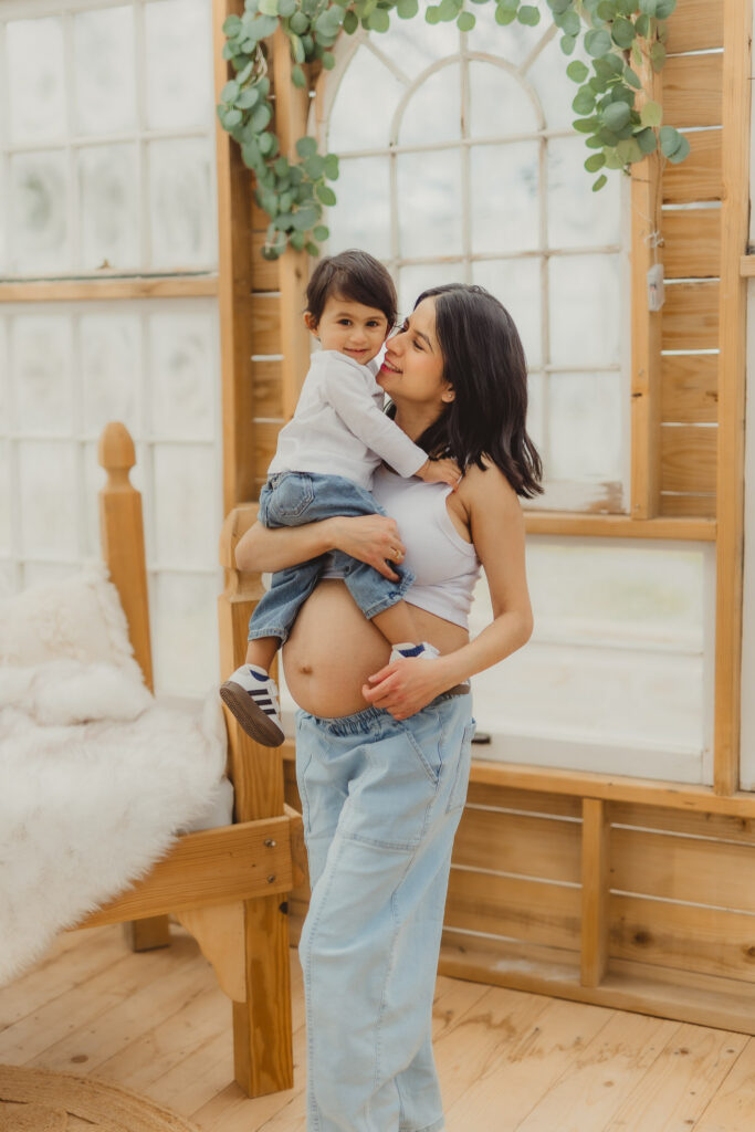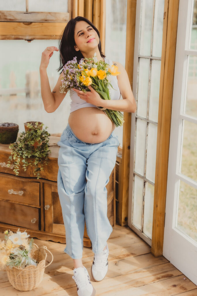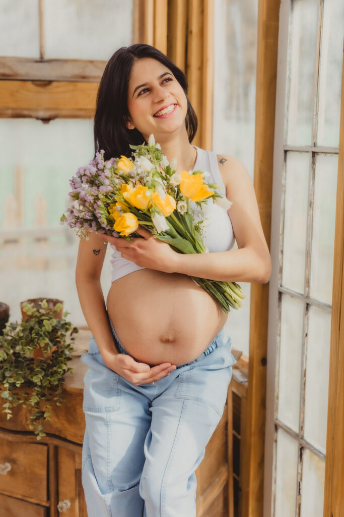 I typically do Bare Belly Maternity Sessions with handmade gowns with foots of fabric made specifically for creating romantic and artsy Maternity Photography. But in contrast I also love a laid back maternity look of white cotton and faded denim, and of course lots of flowers. The simplicity is just as dreamy and artsy in a down to earth wholesome way.
